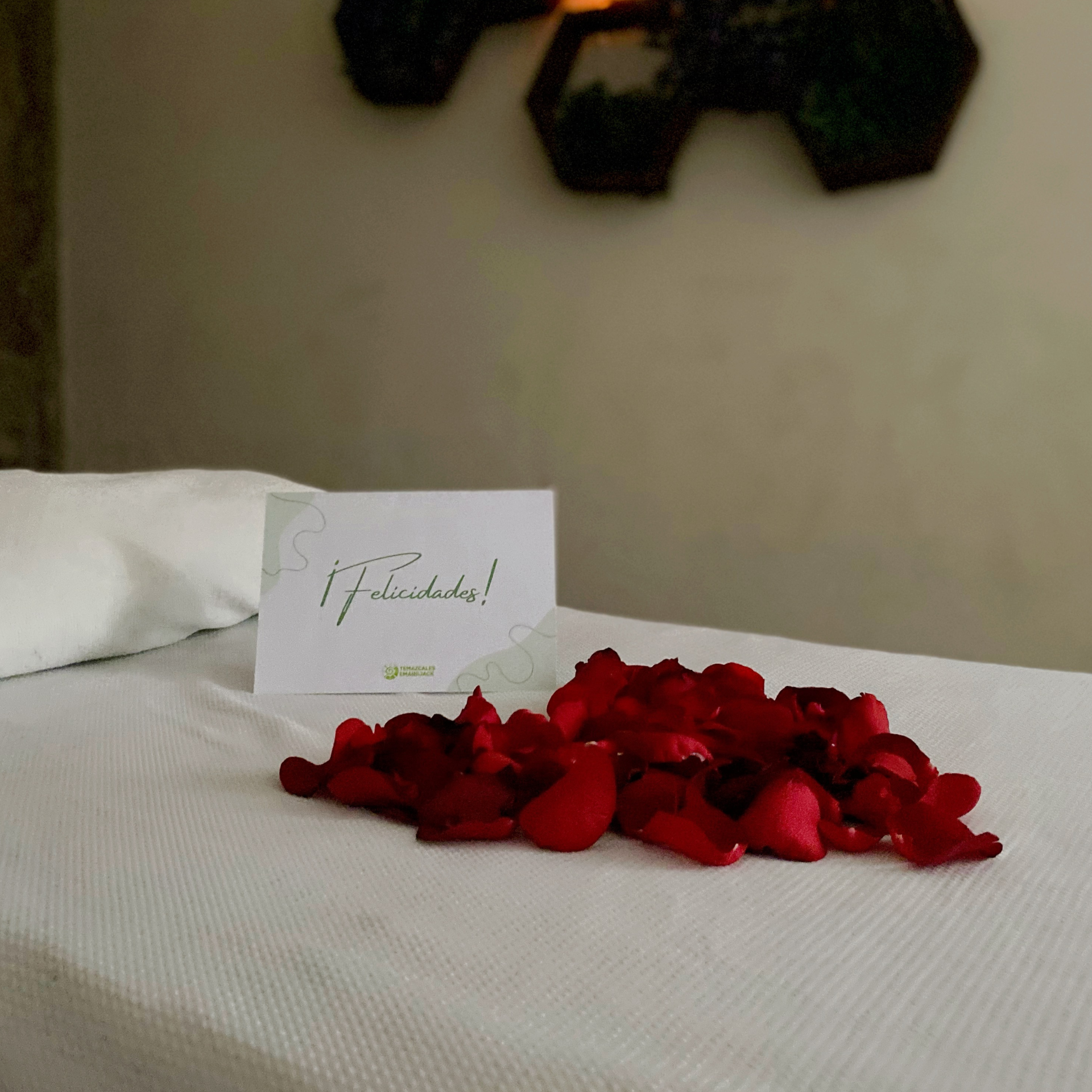 2 Masajes de relajación, 2 Sesiones de temazcal (Individual), Aplicaciones de calor relajante con compresas, Aplicaciones de ventosas relajantes, Mascarillas faciales, Aromaterapia para 2 personas, 2 copas de clericot, 1 Tabla de quesos para 2 personas.