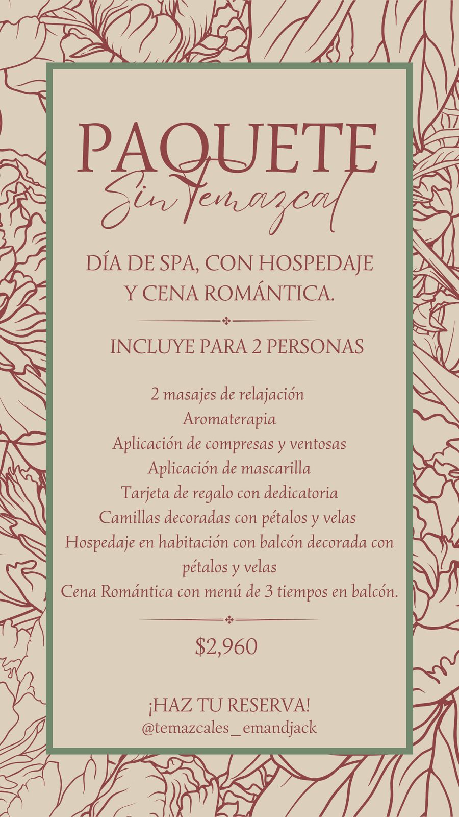 2 Masajes de relajación, 2 Sesiones de temazcal (Individual), Aplicaciones de calor relajante con compresas, Aplicaciones de ventosas relajantes, Mascarillas faciales, Aromaterapia para 2 personas, 2 Quesos fundidos (Choriqueso), Guacamole, frijoles, tortillas y salsa para 2 personas, 2 bebidas a elegir (Mojito, Cantarito o Michelada).