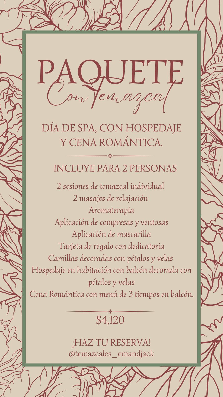 2 Masajes de relajación, 2 Sesiones de temazcal (Individual), Aplicaciones de calor relajante con compresas, Aplicaciones de ventosas relajantes, Mascarillas faciales, Aromaterapia para 2 personas, Café de olla (sin límite de refill), Pan casero, Sopes o quesadillas para dos personas, Agua fresca para dos personas.